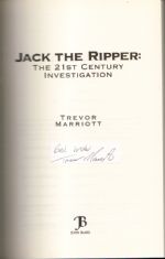 Hardback, SIGNED. 'There have been countless attempts to solve the brutal murders committed more than a 100yrs. ago by Jack the Ripper. It seems that almost everyone has a pet theory, ranging from the reasonably likely to the entirely preposterous. What this most famous of British criminal cases has always required is a clear, professional eye to analyse the evidence with all the benefits of modern investigative techniques. Now that has been provided in the shape of the man most qualified to crack the case - former murder squad detective Trevor Marriott. He casts aside rumours, fantasies and urban legends which have for so long stalked through the shadowy world of this vile killer. The results are startling: for many years it has ben accepted that Jack the Ripper killed only 5 women, but now it can be revealed that up to 9 were victims. And, most astonishingly of all, a suspect previously unconsidered has been firmly put in the frame. Not only that, but similar murders in Europe and Central America have been uncovered with evidence linking them to the Whitechapel murders and the new suspect. Has everyone been wrong all these years?' The author refutes all previous theories. 310pp. 8vo. h/back. With the usual lightly browned pp. o/w Nr. F. in F. protected dw. With tipped-in label SIGNED BY TREVOR MARRIOTT.